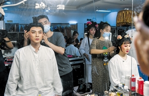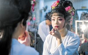 10月28日,原創瓊劇《丘濬》在海南戲院首演。開演前演員正在化妝。
