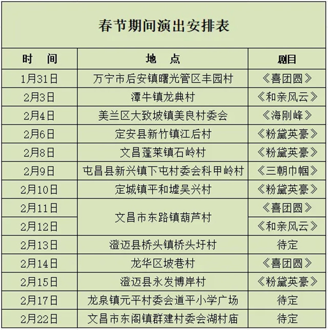 以下是海口市瓊劇團春節期間演出安排表,敬請關注。
