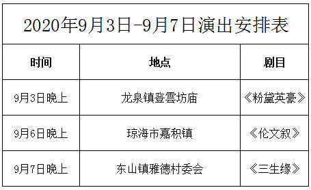 9.3-9.7日瓊劇《粉黛英豪》、《倫文敘》、《三生緣》與您相約,期待與您共度美好時光,詳情請關注以下演出安排表: